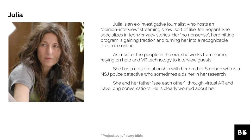 So, the first thing we did was take some of the main elements of the world presented in the report and start developing them into real-life people. Each has their backstories, wants, and needs.