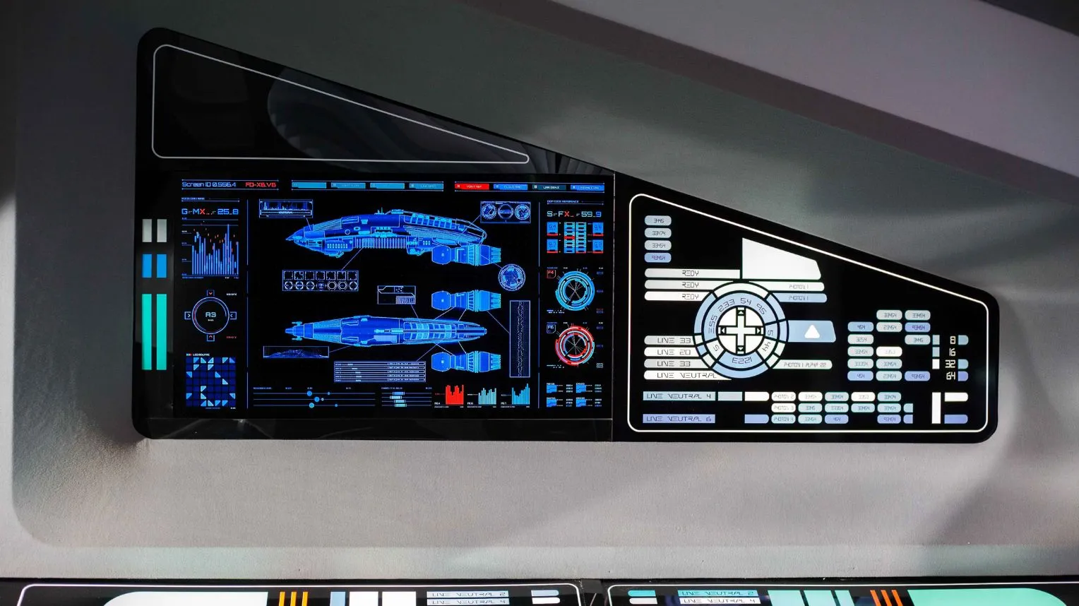 - Hidden lighting systems and back-lit displays to simulate data flow and alarms.